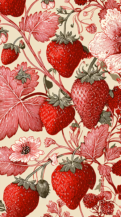 Prompt: beautiful vintage big strawberry linocut floral pattern, detailed foliage, light pink and red, light cream background, detailed foliage, graceful flowers